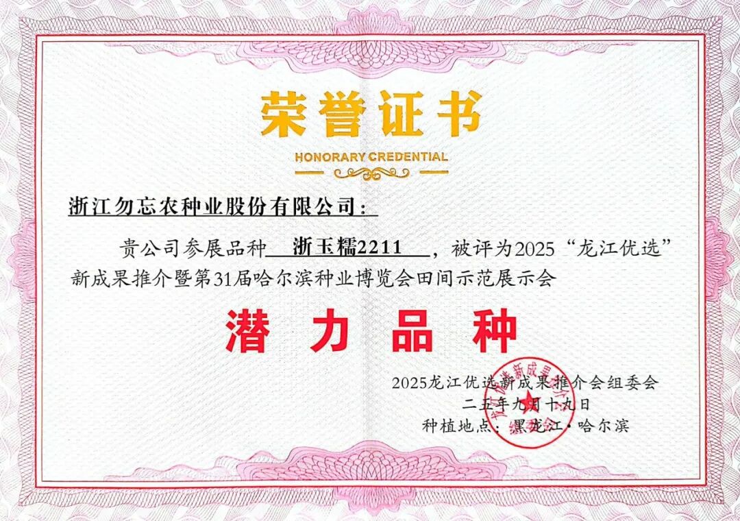 近日,2025年“龙江优选”新成果推介暨第31届哈尔滨种业博览会田间示范展示会在哈尔滨市开幕,公司参展的“浙玉糯2211”荣获潜力品种称号。